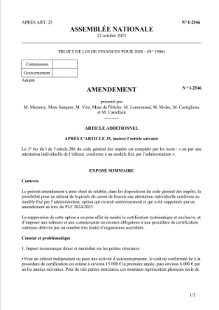 INFORMATION IMPORTANTE Amendement ADOPTÉ par l'Assemblée Nationale le 20 novembre 2025. Promulgation du PLF 2026 fin décembre 2025